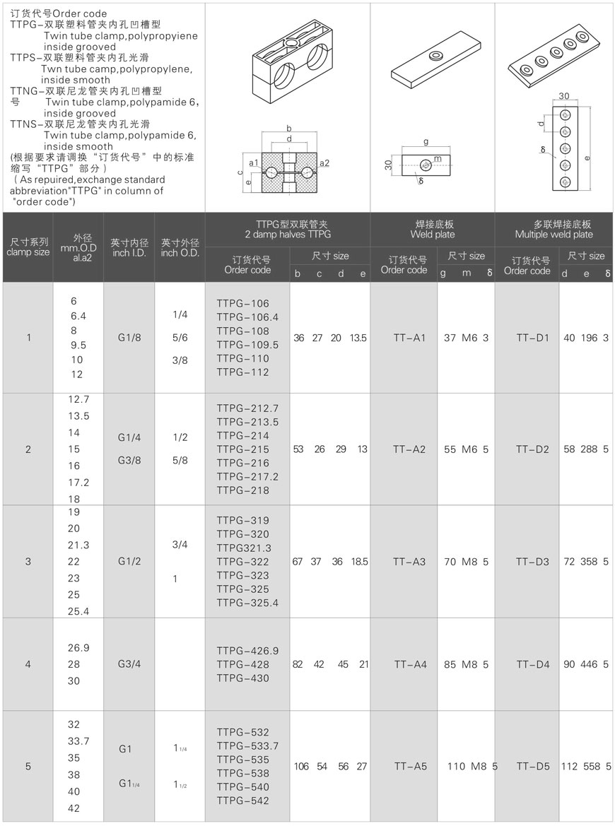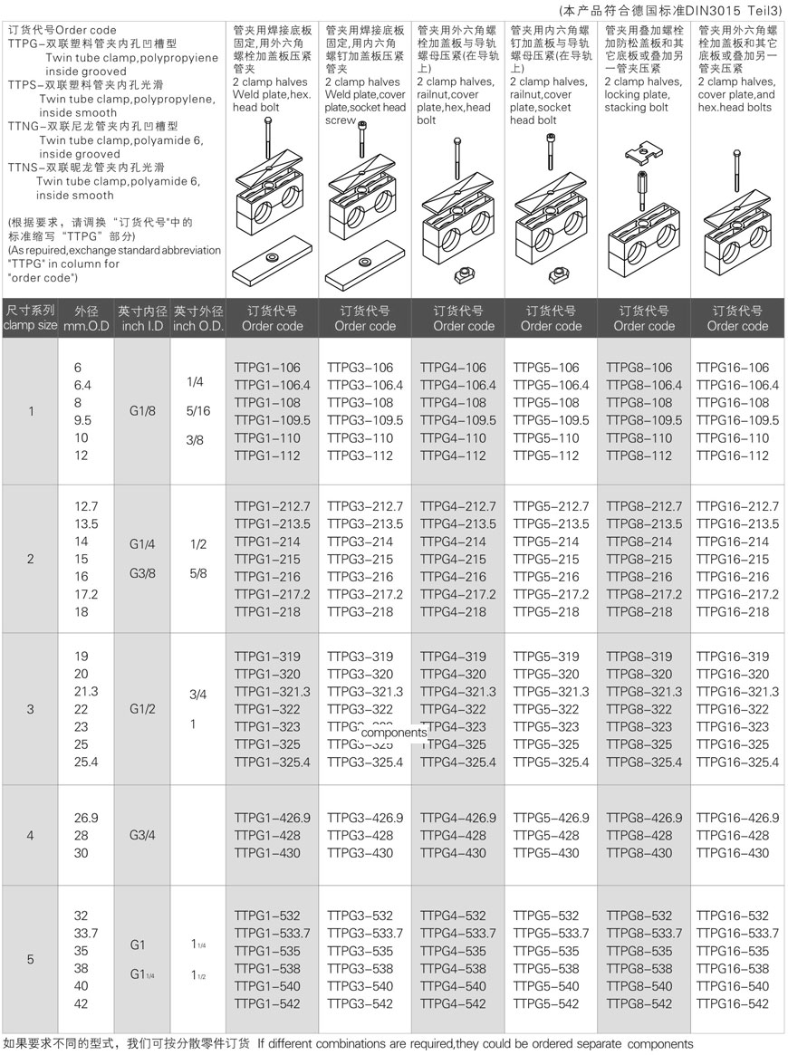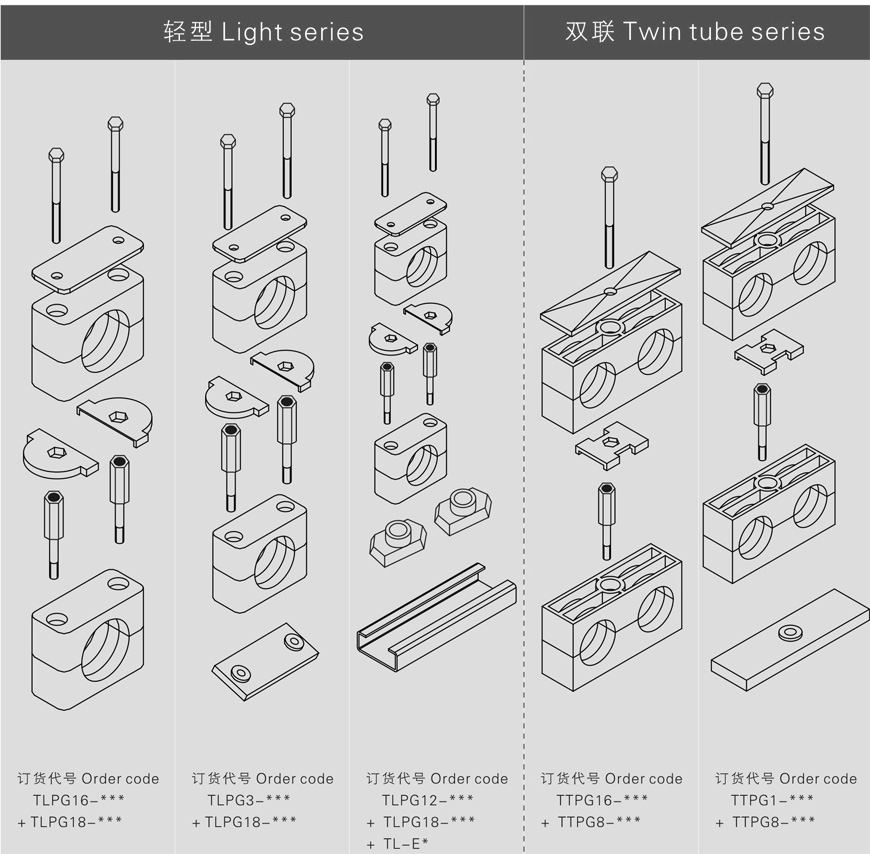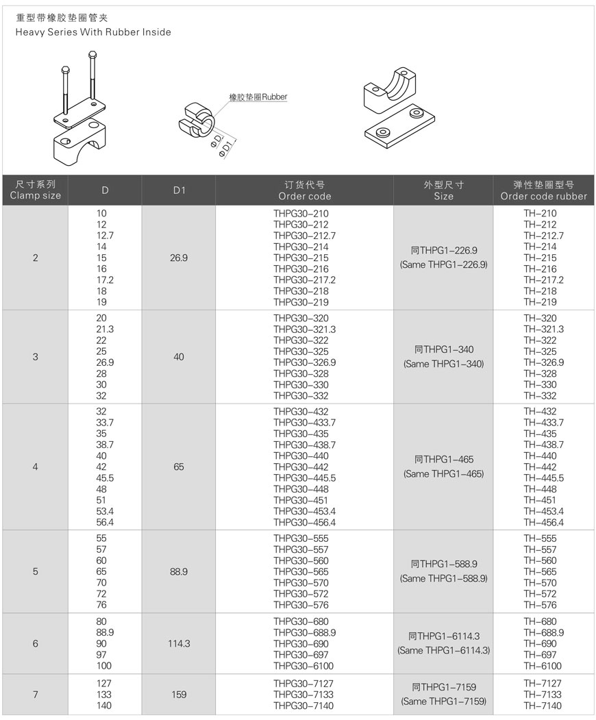 管夾適用范圍 輕型系列管夾應用于6種尺寸系列的普通機械壓力管子,管子外徑Φ6~57mm。 雙聯系列管夾應用于5種尺寸系列的普通機械壓力管子,管子外徑Φ6~42mm。 重型系列管夾應用于8種尺寸系列的高機械壓力管子,管子外徑Φ8~220mm。