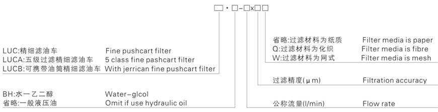 (1)*為過濾精度。若使用介質(zhì)為水一乙二醇時,公稱流量63L/min,過濾精度5μm,過濾材質(zhì)為紙質(zhì)時,濾油車的型號為LUC·BH-63x5或 LUCA·BH-63X5,精濾器濾芯的型號為CZX·BH-63X5或 CZXA·BH-63X5。
